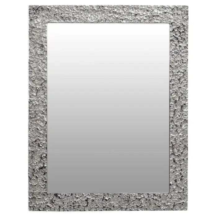 This wall mirror frame has a broad metal border finished in a metallic silver shade surrounding the mirror. It is a perfect addition to any wall or can complement a console as well.
