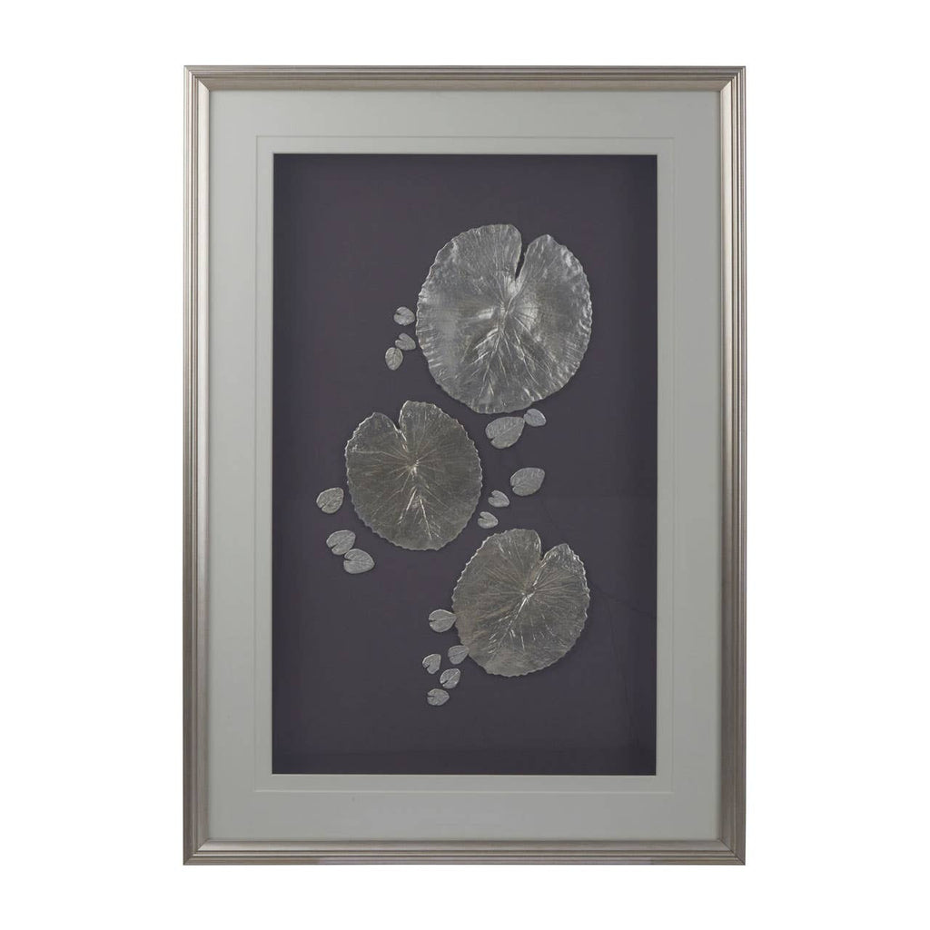 Three metallic leaves sit behind a pane of clear glass, with smaller versions scattered around.
