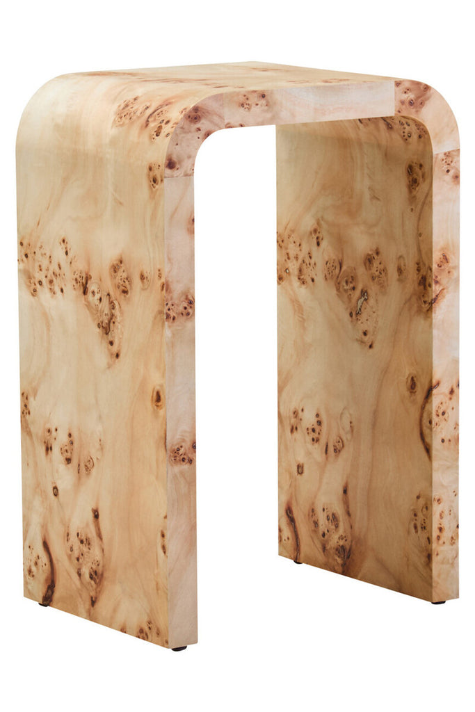 Smoothly curved, this natural burl wood design side table brings a natural charm with contemporary elegance to modern interiors.